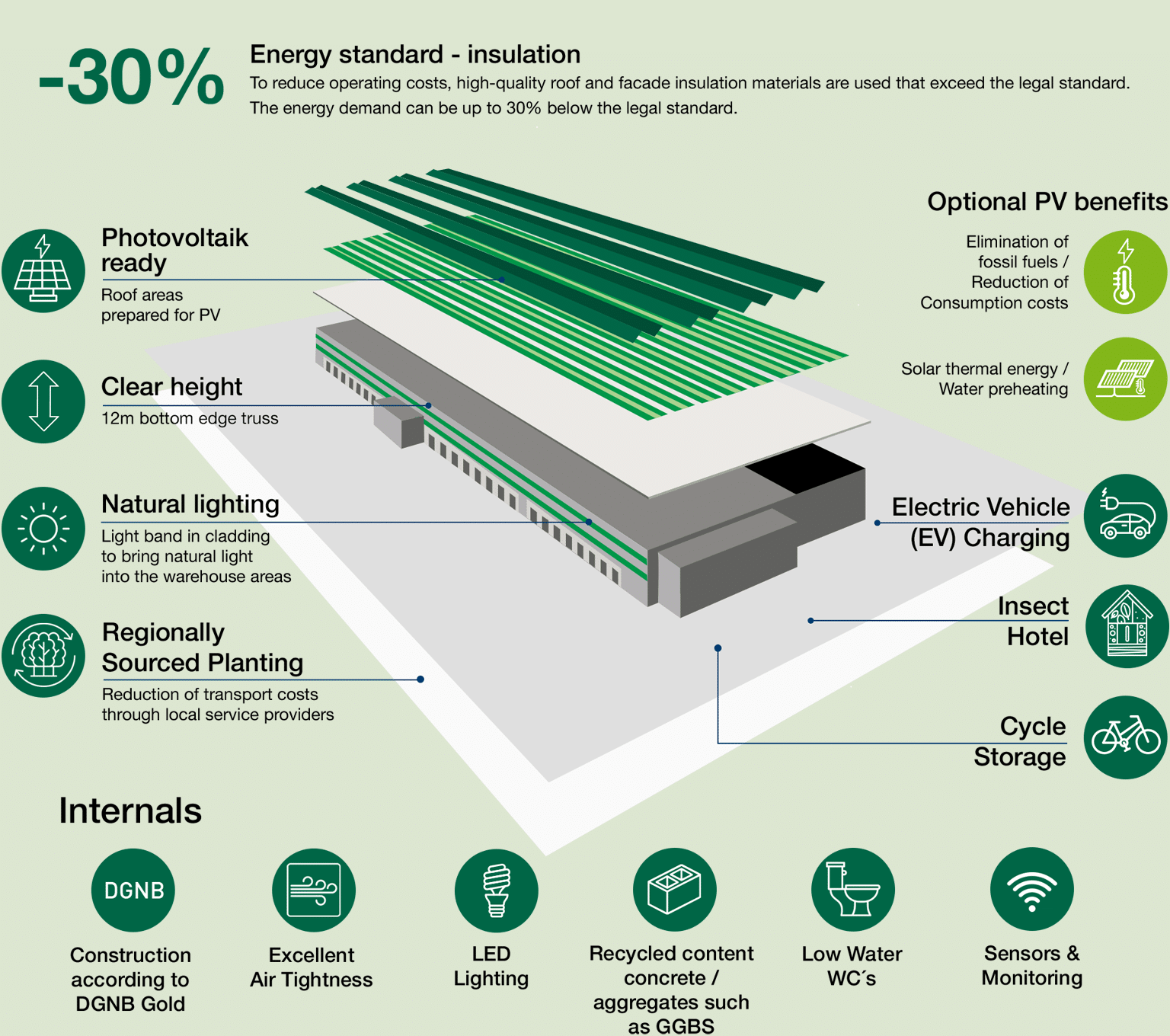 GLP’s logistics- and distribution properties meet high sustainability criteria worldwide through environmentally sound building solutions. All new developments in Germany are certified to at least the DGNB Gold standard, making them more cost-effective to operate and maintain. In addition to reducing operating costs for users, GLP contributes to sustainability by improving the CO2 balance, reducing energy and water consumption, and selecting certified and recyclable building materials.